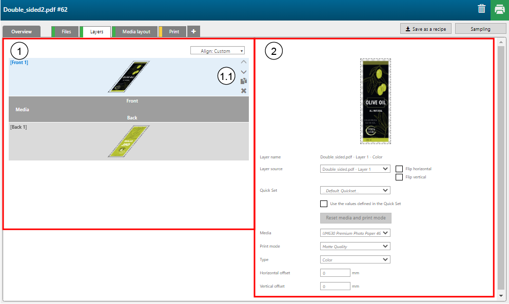在您的设计中,选择在配方中用作图层输入的页面、图层或专色。 当您使用专色作为 [图层来源] ,您的设计中的专色必须有套印属性。 带渐变的专色元素将作为光栅图像处理。 如果您想要水平或垂直翻转图层中的信息,请选取 [水平翻转] 或 [垂直翻转] 选项。 |
