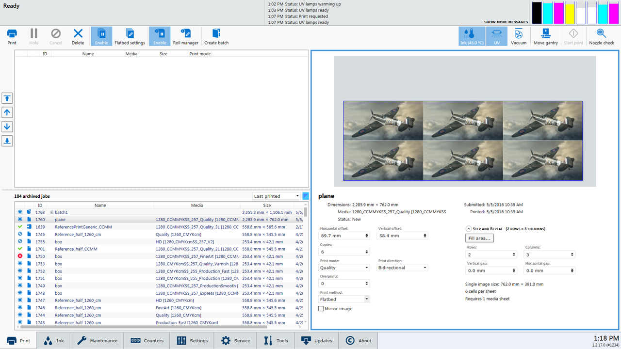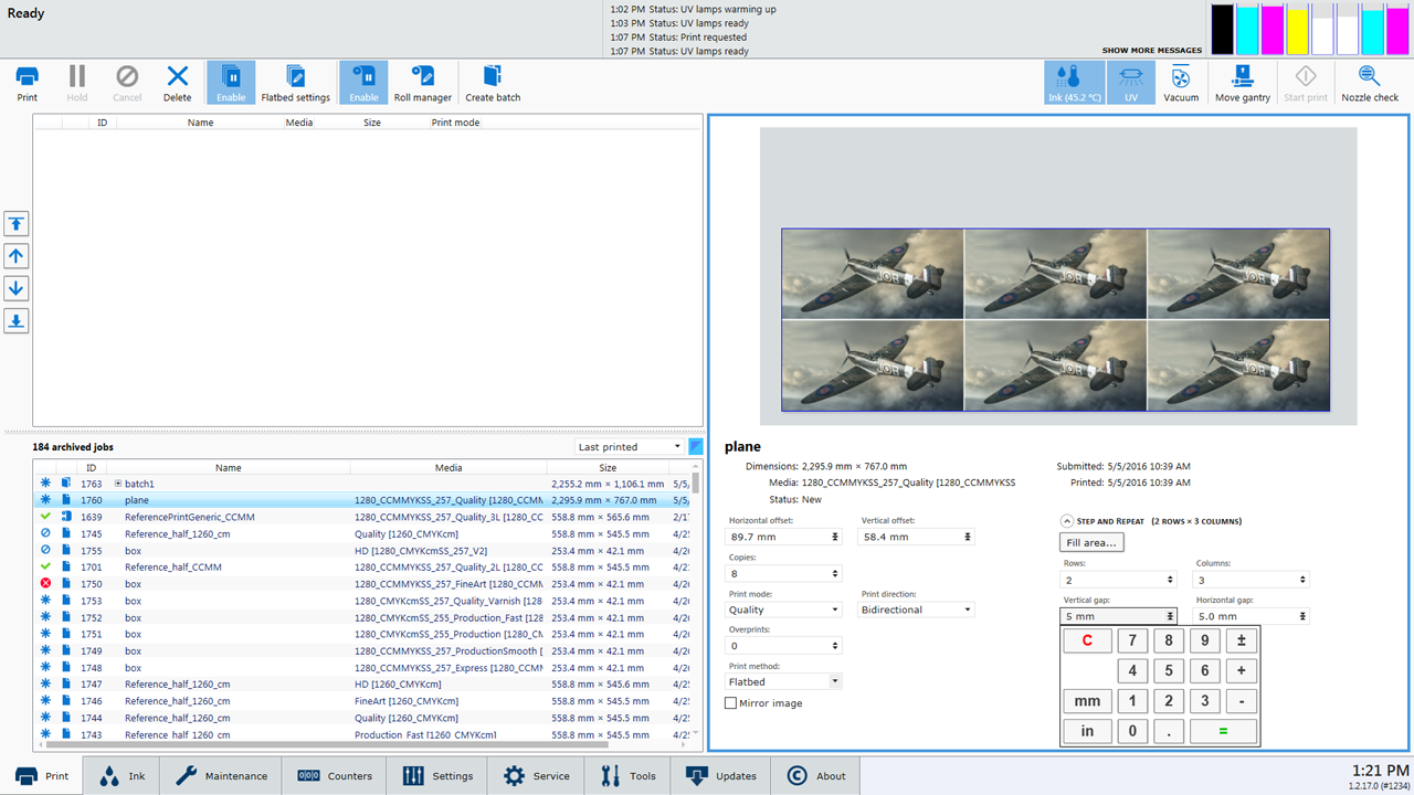 Če je za izdelavo naloga potrebno več od ene pole, se bo pred nadaljevanjem tiskanja voziček vrnil na svoje parkirno mesto in počakal, da namestite novo polo medija, potrdite višino medija in izberete ikono Start print (začni tiskanje).