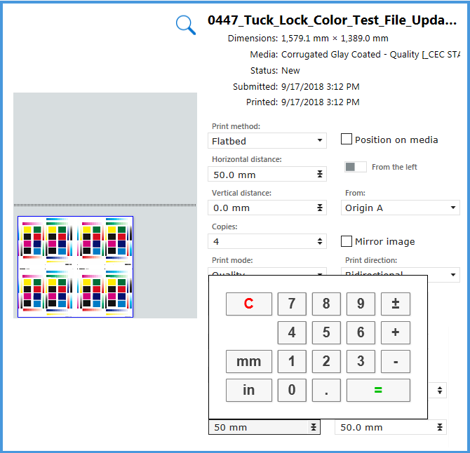 您将会在预览区看到栅格的视觉显示,并从中了解您请求的份数在介质上的纳入情况。如果份数超出介质尺寸,您将会看到 Step and Repeat [分步和重复] 区域底部显示的所需介质张数。