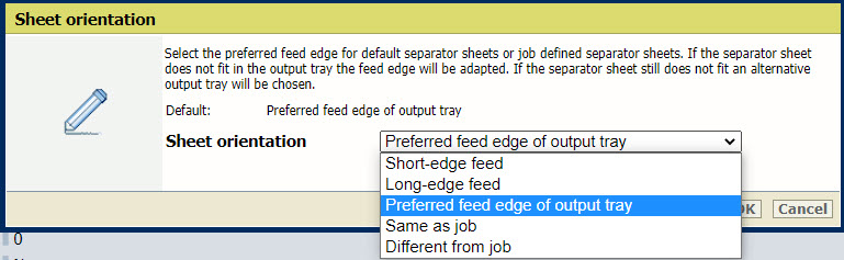 [Bord de chargement préféré du bac de sortie]: les intercalaires sont livrés dans le bac de sortie en fonction du bord de chargement préféré du bac de sortie. Si l’intercalaire ne rentre pas dans le bac de sortie, le bord de chargement est adapté.