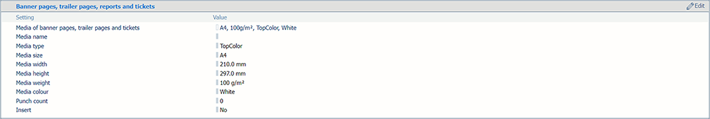 Section [Pages d'ouverture, pages de fin, rapports et tickets] Utilisez le paramètre [Support des pages d'ouverture/de fin, rapports et tickets] pour sélectionner le support par défaut des pages d’ouverture et de fin.