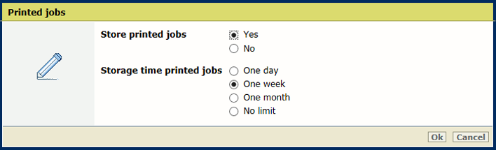 4. Utilisez le paramètre [Durée de stockage des travaux imprimés] pour sélectionner la durée de stockage des travaux imprimés : [Un jour], [Une semaine], [Un mois] ou [Aucune limite].