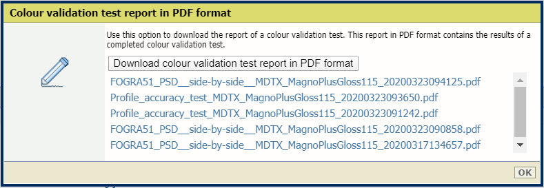 Du kan laste ned en detaljert rapport i PDF-format og CGATS-format for den utførte fargevalideringstesten.