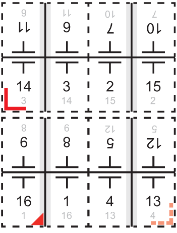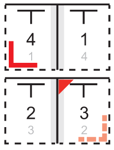 Referencehjørne på forsiden af et ikke-foldet ark (når det er placeret på den modsatte side)
