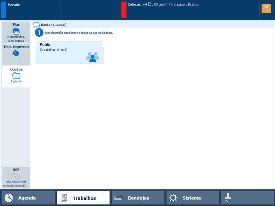 A DocBox é de um destino de trabalhos para recolha de trabalhos antes de imprimir. As pastas DocBox tornam mais fácil agrupar trabalhos de acordo, por exemplo, com um proprietário de trabalho ou um departamento. Também é possível criar pastas DocBox para trabalhos que devem ser impressos de acordo com requisitos específicos. A pasta DocBox [Public (Público)] pode ser acedida por todos os operadores.