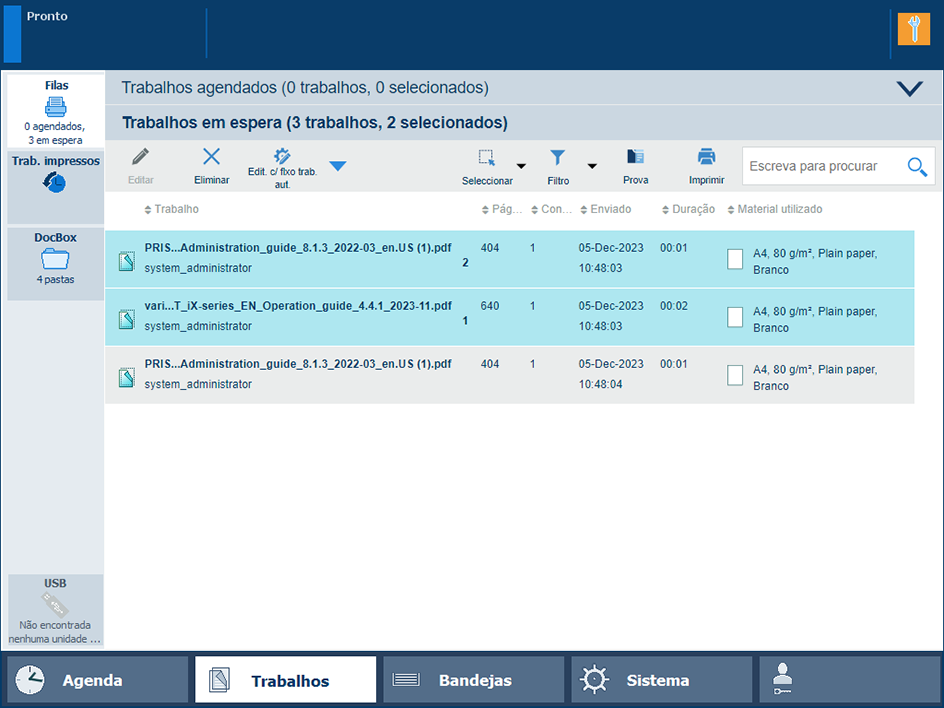 Quando os trabalhos chegam à lista dos trabalhos em espera, é possível determinar a ordem de impressão dos trabalhos. Pode também alterar as definições de trabalho de impressão ou executar a programação de páginas. Com uma das funções de seleção, pode selecionar os trabalhos e dar o comando de impressão. Os trabalhos são adicionados à lista de trabalhos agendados.