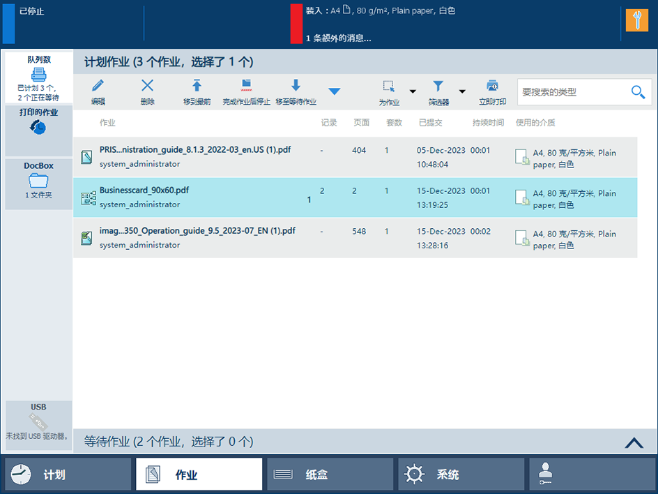 作业进入等待作业列表时确定作业的打印顺序。还可以更改打印作业设置或执行页面编排。您可以通过某一选择功能选择作业并给出打印命令。作业将被添加到计划作业列表。