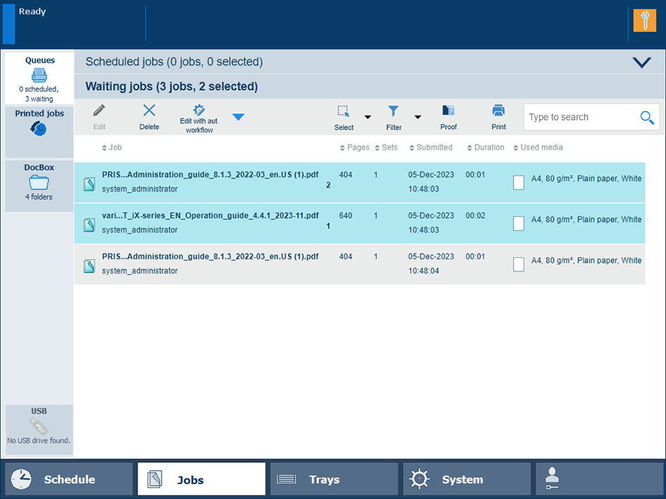 当打印系统处于交易打印模式时,PRISMAsync 将流作业直接传送到计划作业列表。