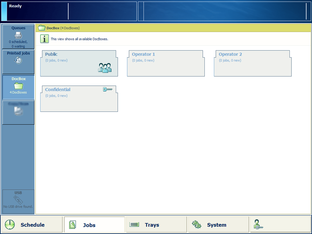 Die DocBox ist ein Auftragsziel, um Aufträge vor dem Drucken zu sammeln. DocBox-Ordner erleichtern die Gruppierung von Aufträgen, z. B. nach Eigentümer des Auftrags oder nach Abteilungen. Sie können auch DocBox-Ordner für Aufträge erstellen, die nach bestimmten Anforderungen gedruckt werden müssen. Auf den DocBox-Ordner [Public] können alle Bediener zugreifen.