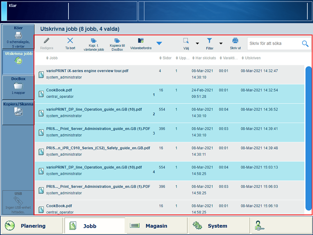 När jobb anländer till listan över väntande jobb kan du bestämma utskriftsordning för jobben. Du kan också ändra utskriftsjobbsinställningarna eller utföra sidprogrammering. Du väljer jobb med en av urvalsfunktionerna och anger utskriftskommandot. Jobben skickas direkt till listan över planerade jobb.