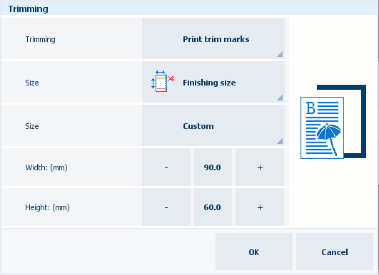 You are required to define the trimming settings to be able to customize the end size of your product. If you do not select [Print trim marks], you will not be able to define the needed imposition.