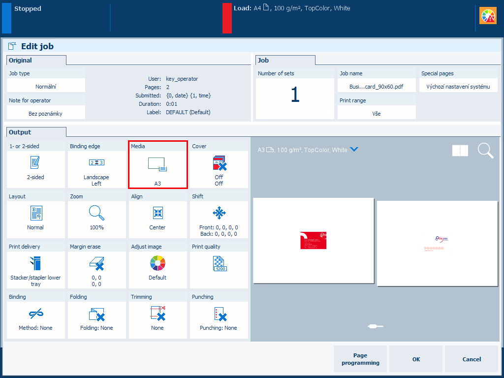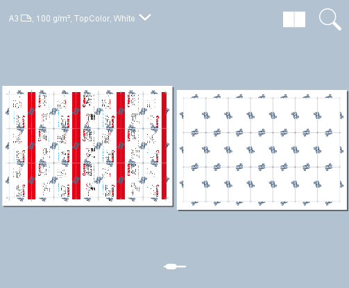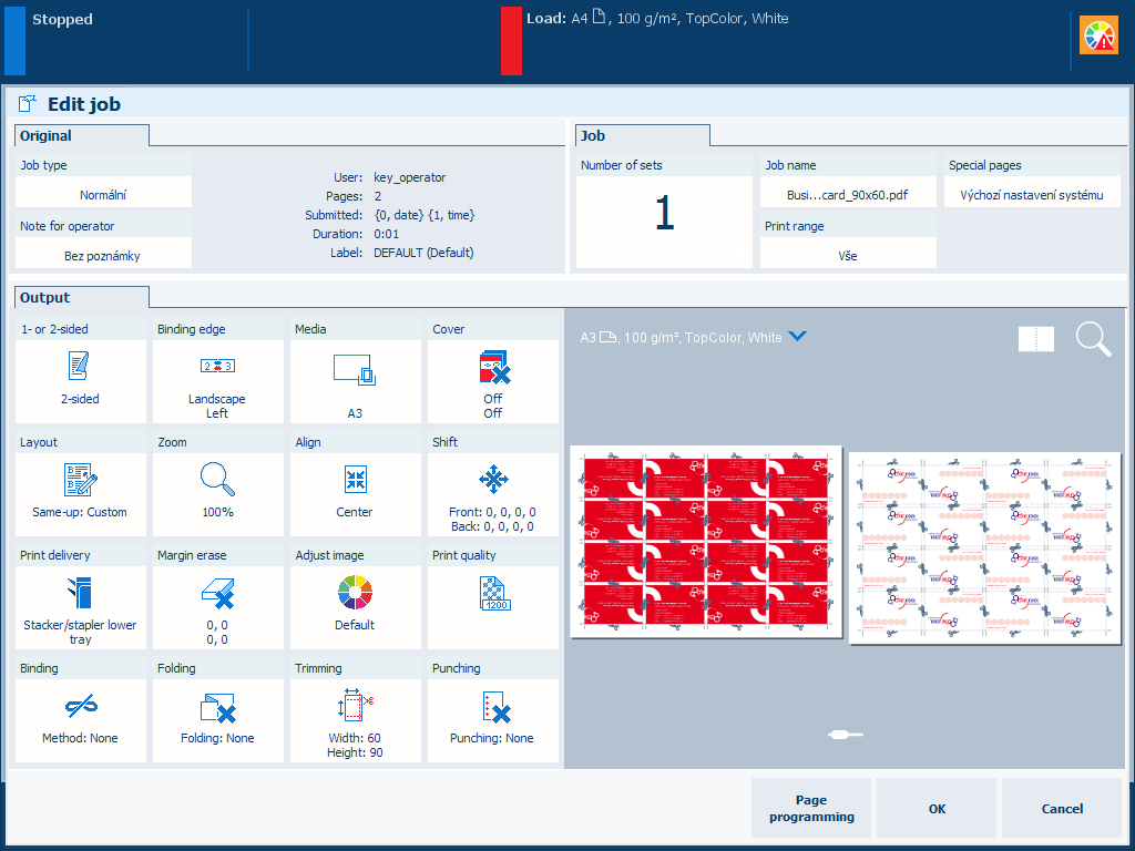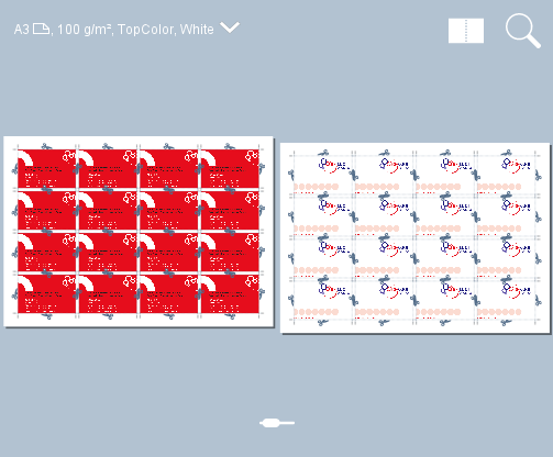 This procedure shows an example of imposition of business cards. Business cards are printed on a double-sided sheet. After trimming, different stacks are created. In the end, each stack contains the same number of the business cards.