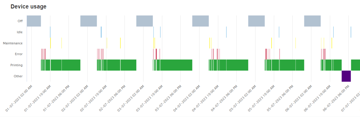 Visninger [Tidslinje] viser brugen af en enhed på en tidslinje. Du kan bruge denne visning til at analysere enhedshændelser for de seneste 30 dage.