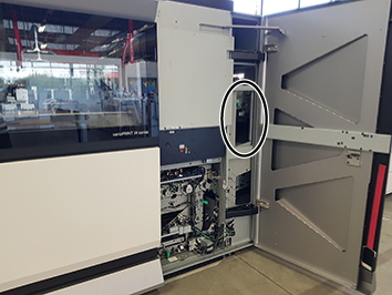 Abra a porta da direita do módulo de impressão. A localização do Sensor z (2) é indicada na imagem. |