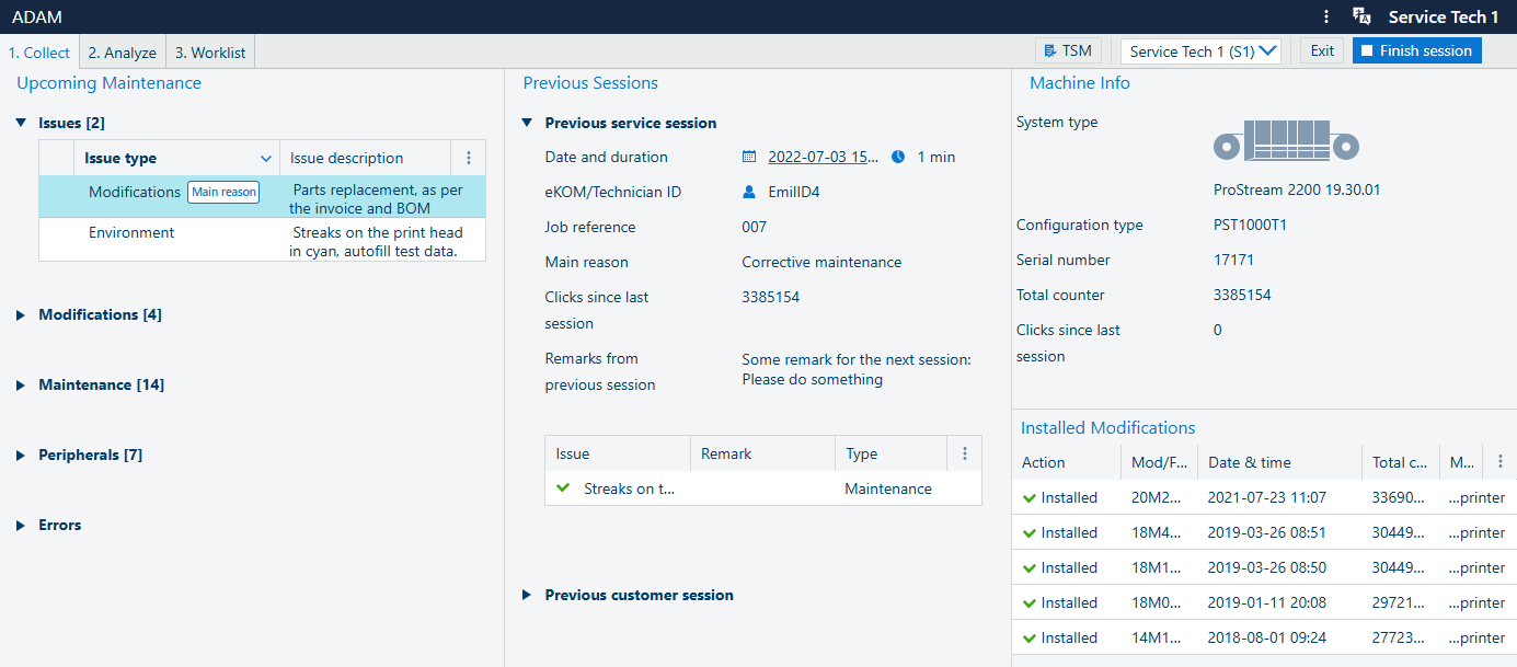 In the [Collect] screen you see all collected machine info, and you can start a new visit or finish the current one. Various relevant information from the previous visit is available in this screen.