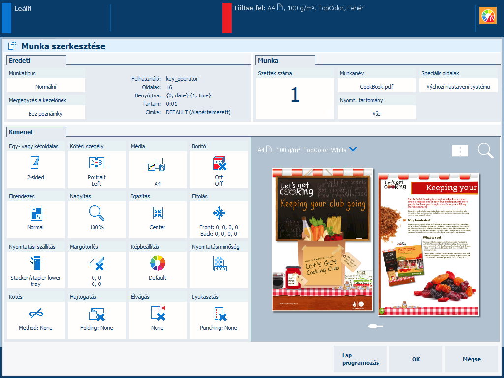 A nyomtatási munka beállításai a alatt, a PRISMAsync Remote Printer Driver, a PRISMAremote Manager alkalmazásban és a kezelőpanelen érhetők el.