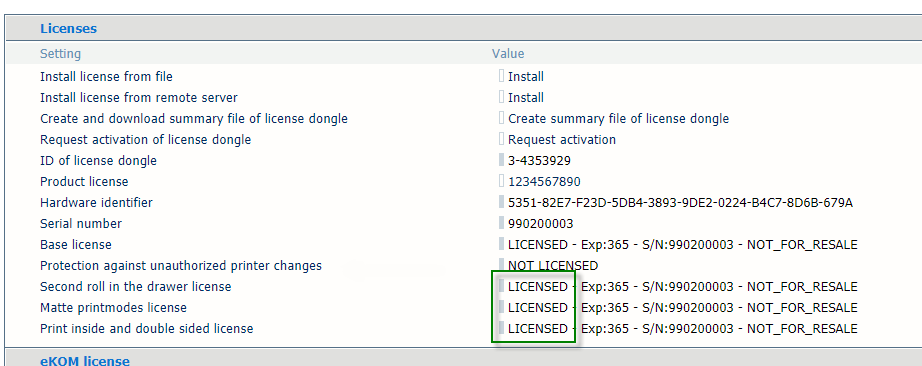 Zkontrolujte, zda jsou požadované doplňky licencovány podle očekávání. V tuto chvíli jsou k dispozici licence, ale nejsou aktivovány. Například: