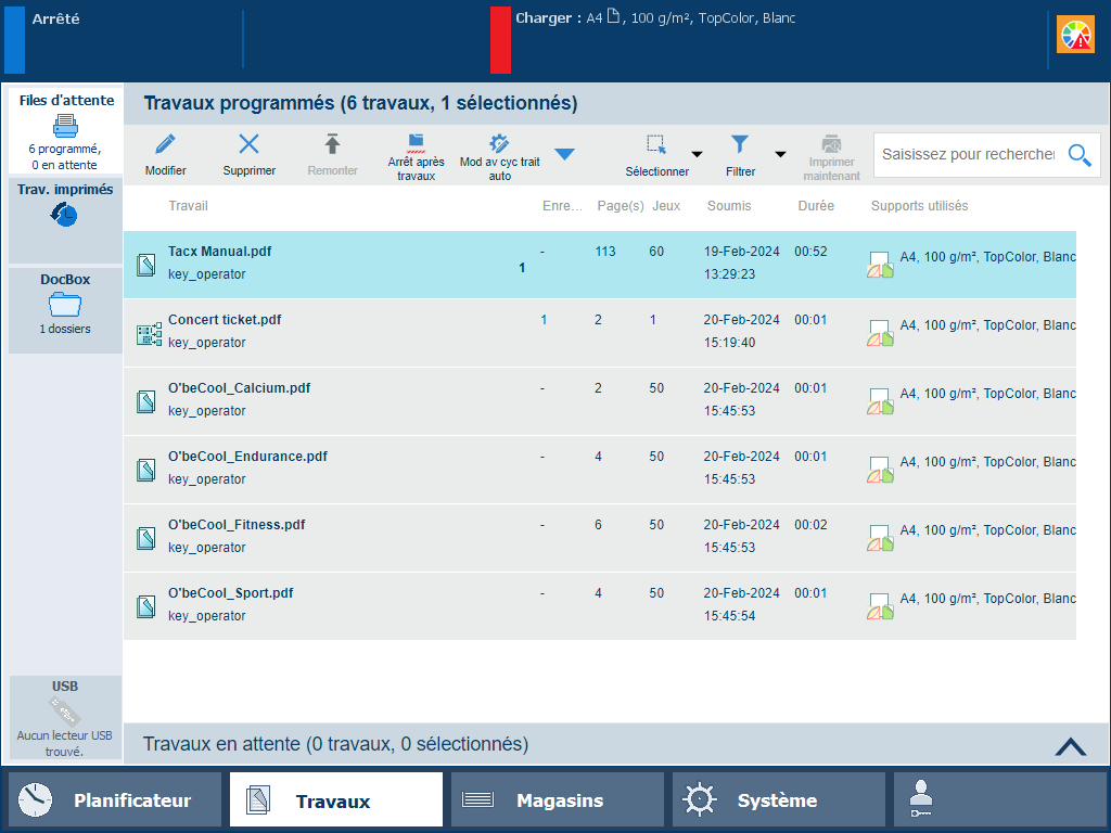 [Files d'attente]: la liste des travaux en attente et la liste des travaux planifiés.