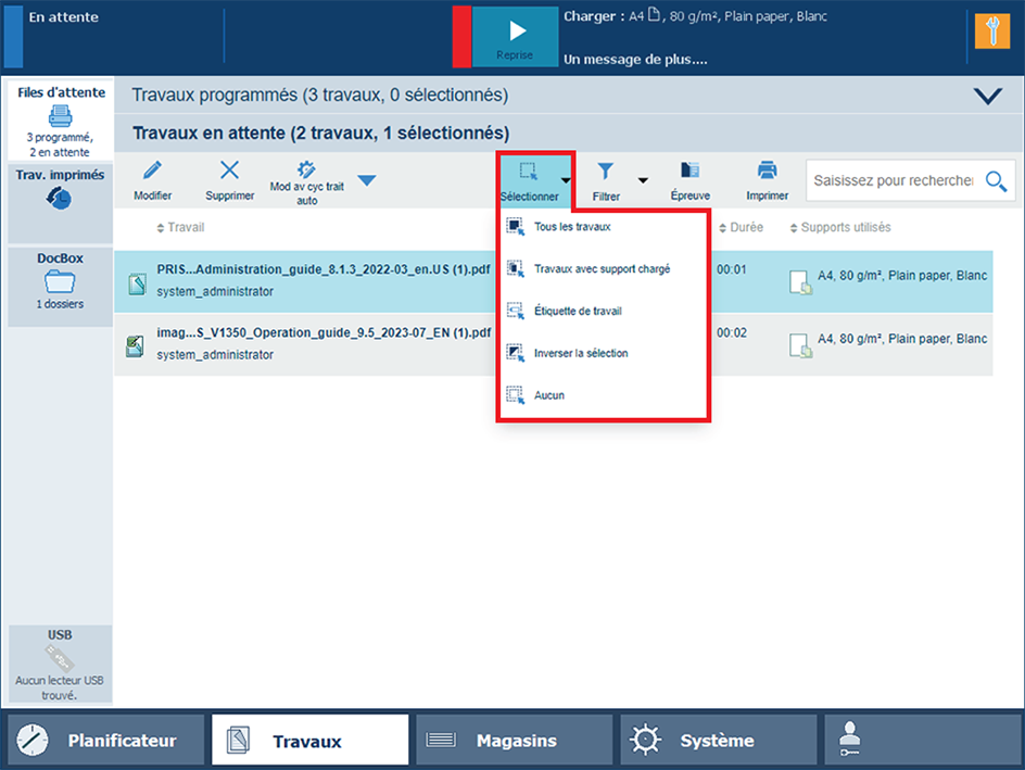 Sélectionnez et désélectionnez des travaux en appuyant sur les débuts de travaux ou utilisez le menu [Sélectionner] pour sélectionner l'option de sélection requise :