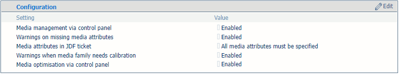 The PRISMAsync Print Server media catalog lists all media that can be selected for jobs. You can change several media settings.