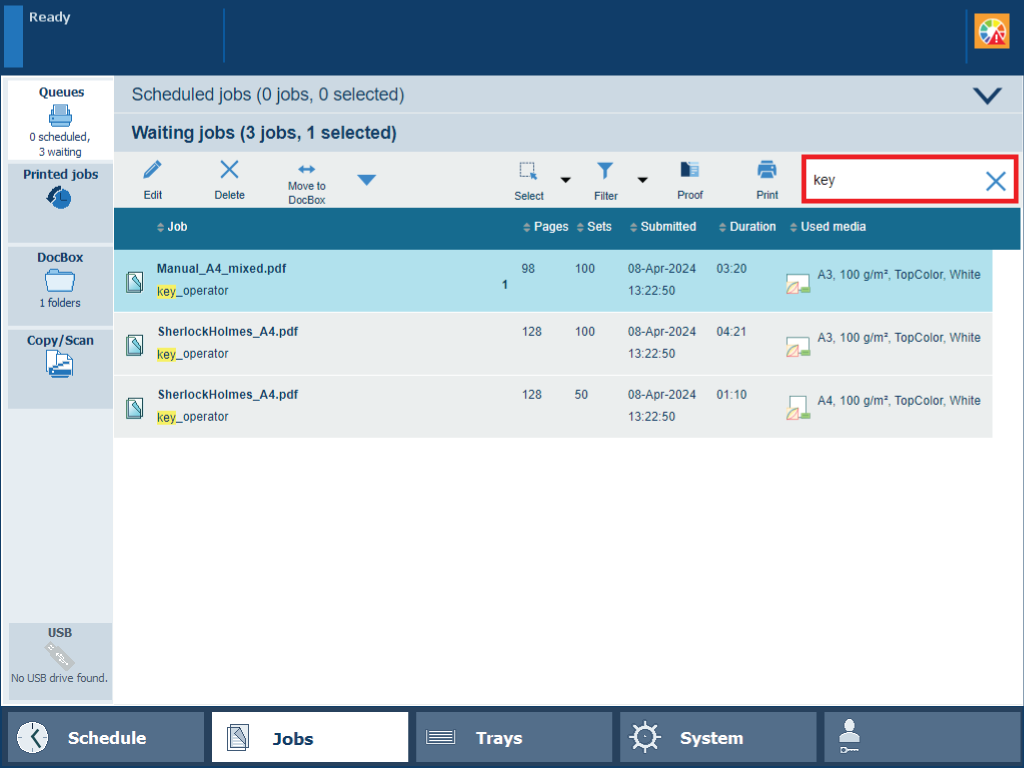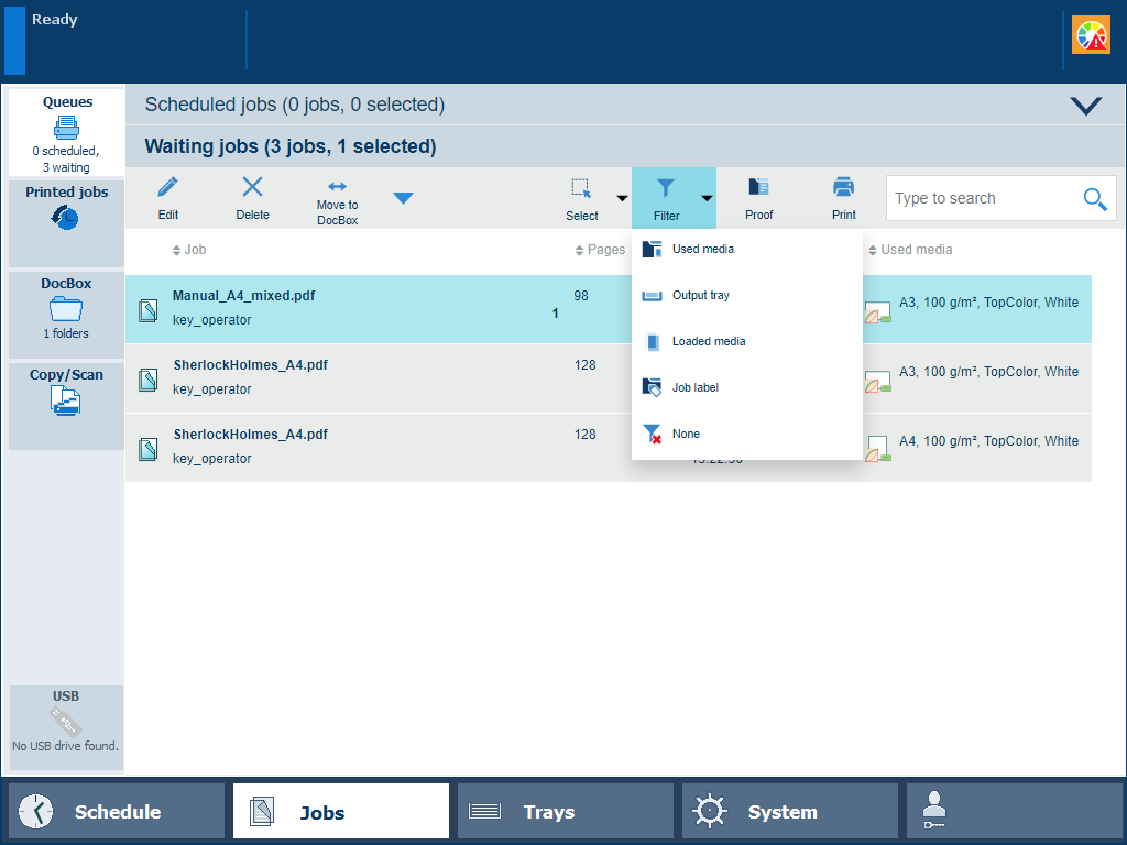 To organize the print workflow to your preferences, you can find, filter and select print jobs.