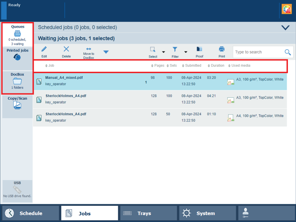 • [Jobs with loaded media]: jobs that use media that are in the paper trays.