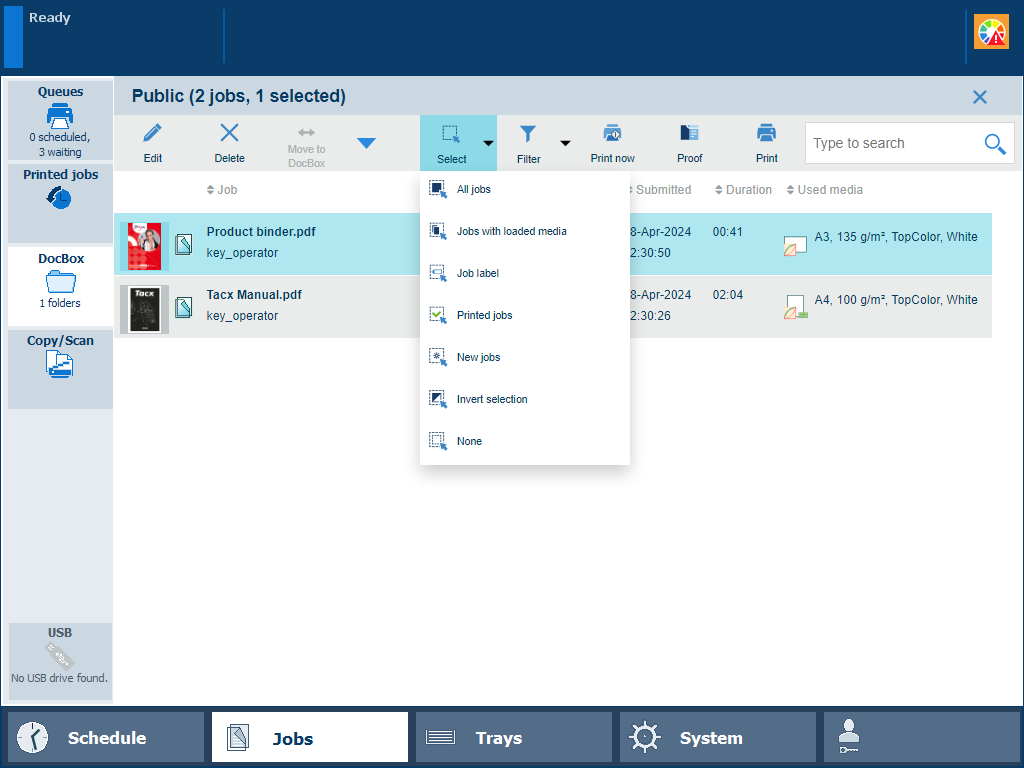 2. Select and deselect jobs by tapping the job entries or use the [Select] menu to select the required selection option: