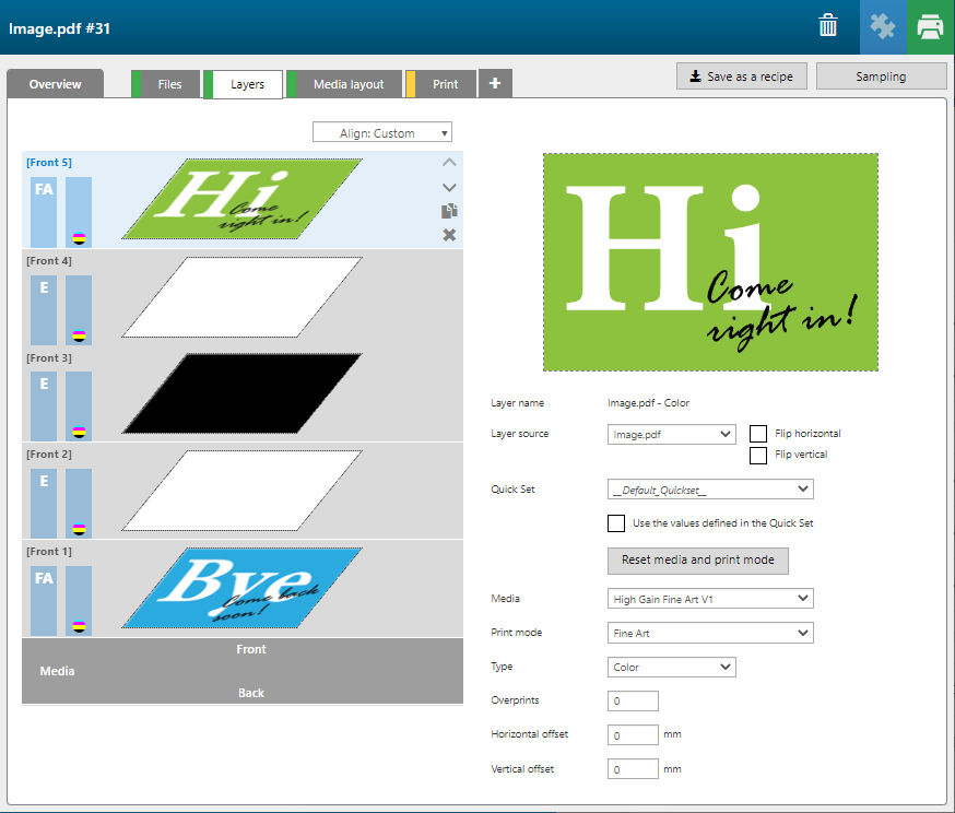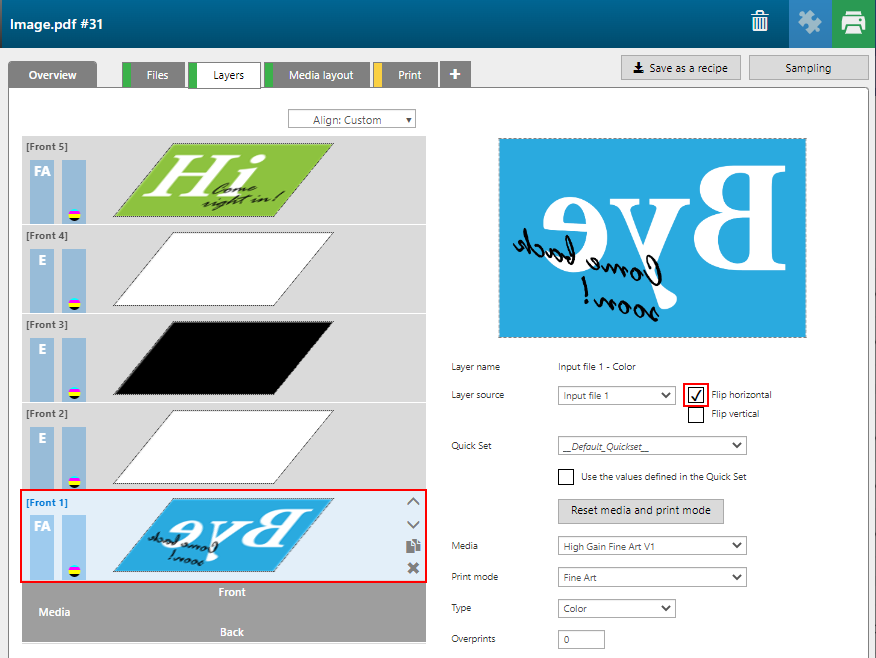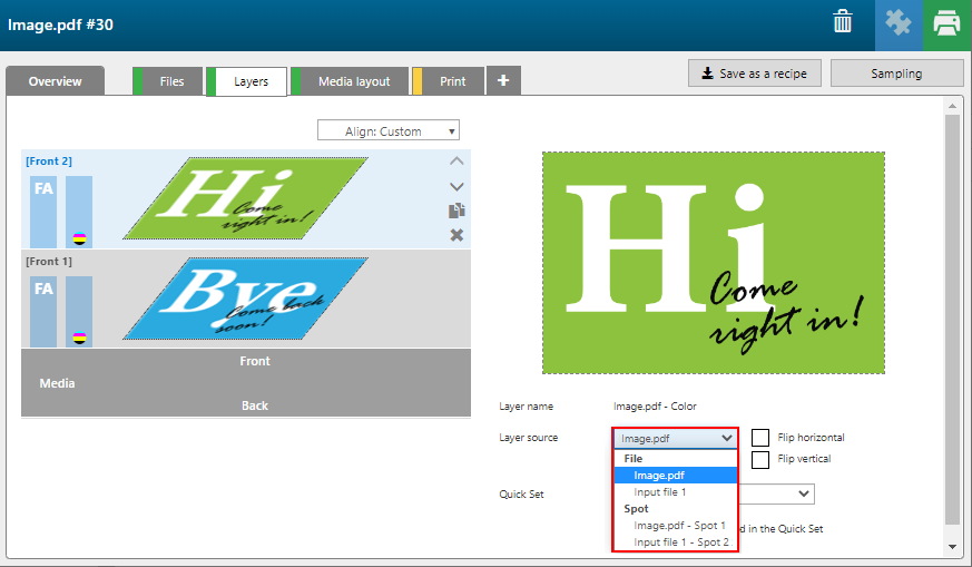 In diesem Beispiel ist die [Herkunft des Layers] für [Vorderseite] 2 die Image.pdf und für [Vorderseite] 1 die Inputfile 1.