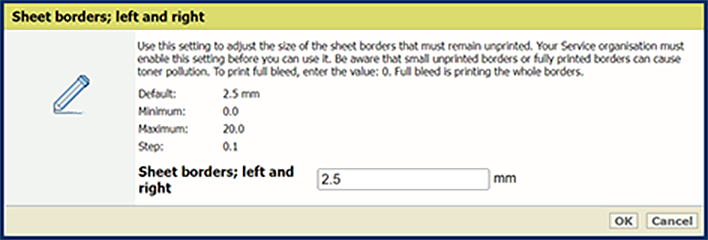 Vegye figyelembe, hogy a kicsi, nem nyomtatott szegélyek és a teljes körűen nyomtatott szegélyek a toner szennyeződéséhez vezethetnek. A teljes háttérkitöltés nyomtatásához írja be a 0 értéket. A teljes háttérkitöltés a teljes keretet nyomtatja.