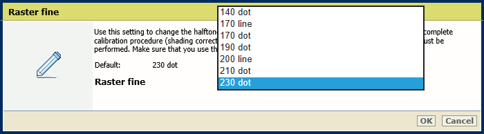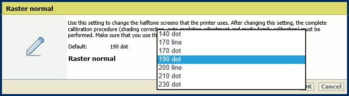 Utilisez ce paramètre pour modifier les trames de demi-teintes que l'imprimante utilise. Après la modification de ce paramètre, la procédure complète de calibrage (correction des dégradés, réglage automatique de la gradation et calibrage de la famille de supports) doit être réalisée. Assurez-vous d'utiliser les profils de sortie correspondants dans la famille de supports.