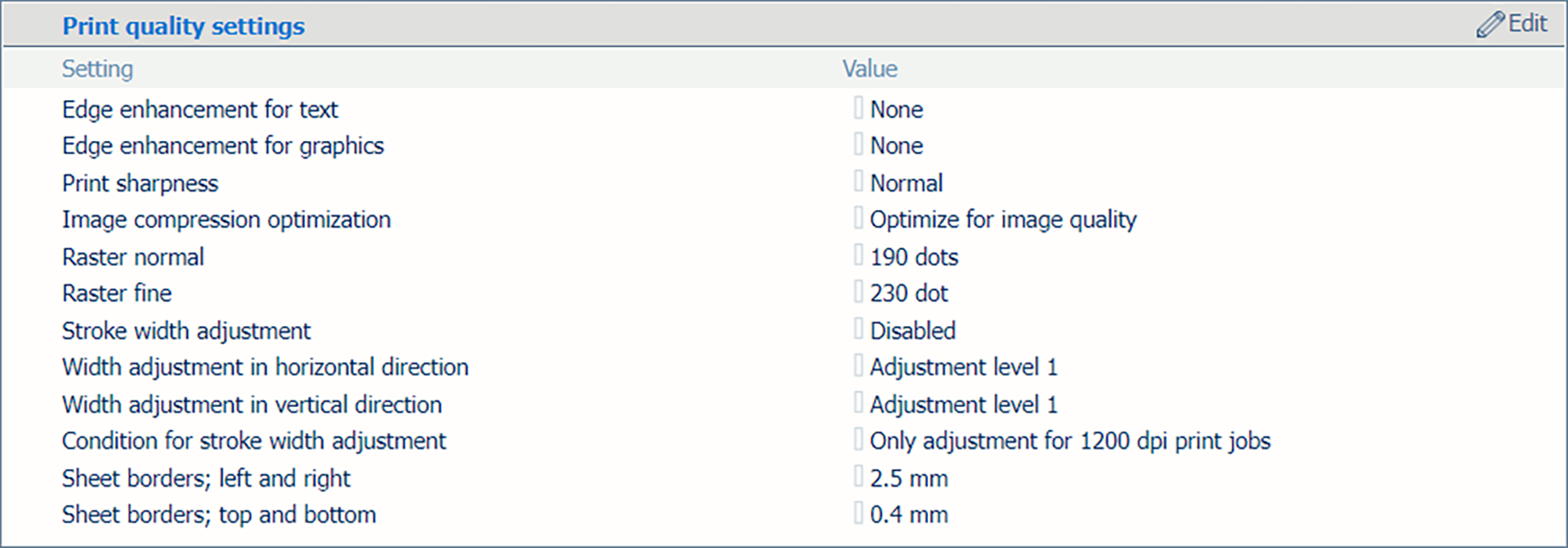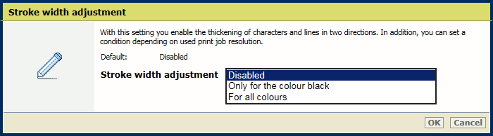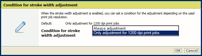 4. Utilisez le paramètre [Condition pour le réglage de la largeur du trait] pour indiquer si vous souhaitez des caractères et des lignes plus épais pour tous les travaux ou pour les travaux à 1200 dpi (ppp) uniquement.