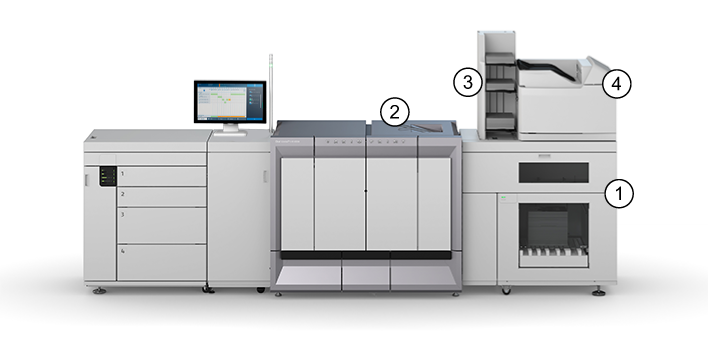 Het apparaat ondersteunt verschillende uitvoerlocaties voor de afgedrukte opdrachten. De standaardconfiguratie van het apparaat bevat een stapeleenheid en de systeemuitvoer. Het afwerkstation is een optionele uitvoerlocatie. Daarnaast kunt u meerdere optionele externe afwerkstations op het apparaat aansluiten.