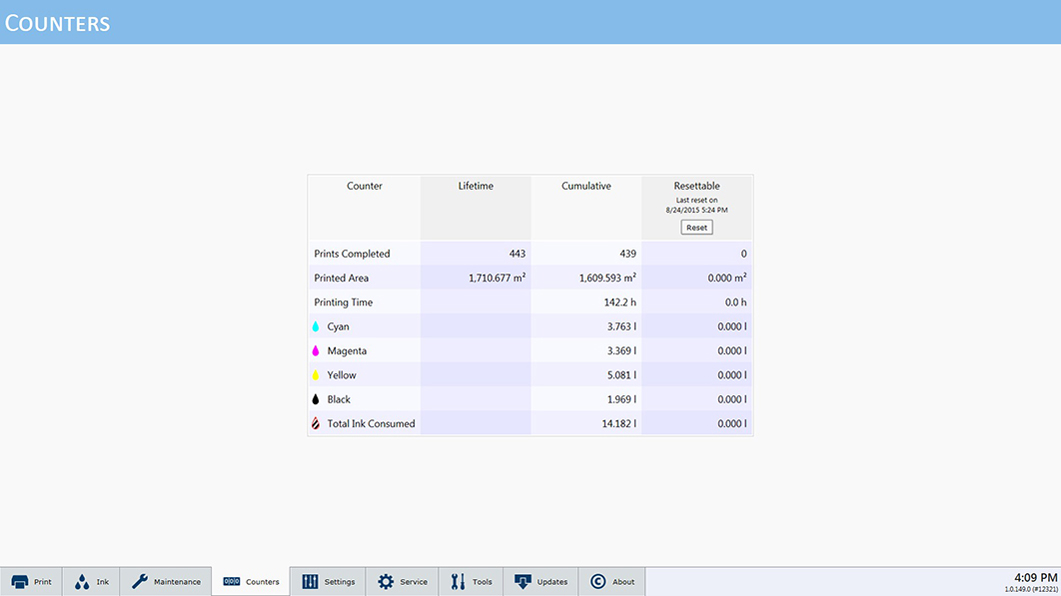 Modulul contoare afișează contoarele care prezintă interes pentru operator. Acesta afișează contoarele pentru fiecare culoare de cerneală și cerneala totală utilizată. Unele contoare pot fi resetate.