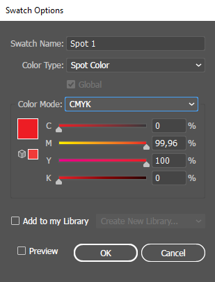 Det är möjligt att ha mer än ett spotelement i en bild, men varje element måste ha samma spotfärgdata och därför ha samma opacitetsnivå, annars kommer ONYX Thrive att behandla det sparade dokumentet som en separationsfil. CMYK är det föredragna läget, eftersom åtgärderna som krävs för att skapa dekorfärgsdata är enklare än de för RGB.