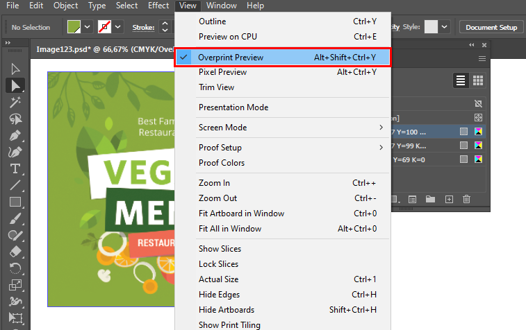 När du har ställt in övertrycksalternativ kan du använda läget Övertrycksförhandsgranskning (Visa > Övertrycksförhandsgranskning) för att se en uppskattning av hur övertrycksfärgerna kommer att skrivas ut genom att tillhandahålla en "bläckförhandsgranskning" som ger en uppskattning av hur transparens och övertryck kommer att se ut i utskriften.