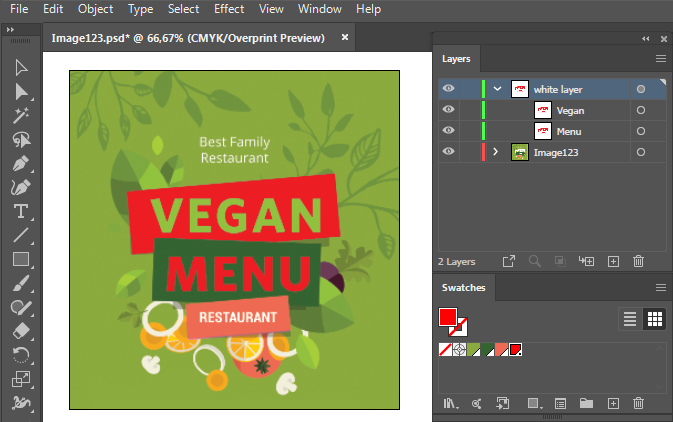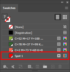 I det här avsnittet förklaras hur du förbereder vektorbaserade bilder för utskrift av filer med spotfärger. På Adobe Illustrator kan du skapa eller tilldela objekt som måste skrivas ut i vitt eller lack/glans. Det finns två spotfärger tillgängliga: Spot1 och Spot2. I allmänhet används Spot1 data för att definiera vita områden och Spot2 data för att definiera områden med lack/glans.