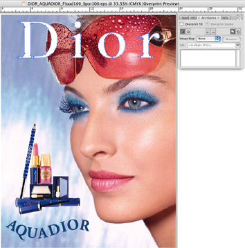 Som standard udskærer den øverste farve (skærer et hul i) området af det farvede billede, der ligger under, når der udskrives ugennemsigtige, overlappende farver. Overprint forhindrer udskæring og gør det muligt at udskrive farvede billeder oven på andre farver, der anvendes, som i dette tilfælde er hvid. Der skal overprintes, når illustrationer skal udskrives oven på hvidt, normalt hvis materialet ikke er hvidt, og der derfor kræves hvidt til at vise billeddata nøjagtigt.
