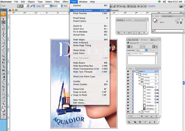 Anteprima della sovrastampaDopo aver definito le opzioni di sovrastampa si dovrebbe usare la modalità Overprint Preview (View > Overprint Preview) per vedere un'approssimazione della stampa finale delle proprie scelte mediante una "anteprima inchiostro" che rappresenta come trasparenza e sovrastampa appariranno sull'output.