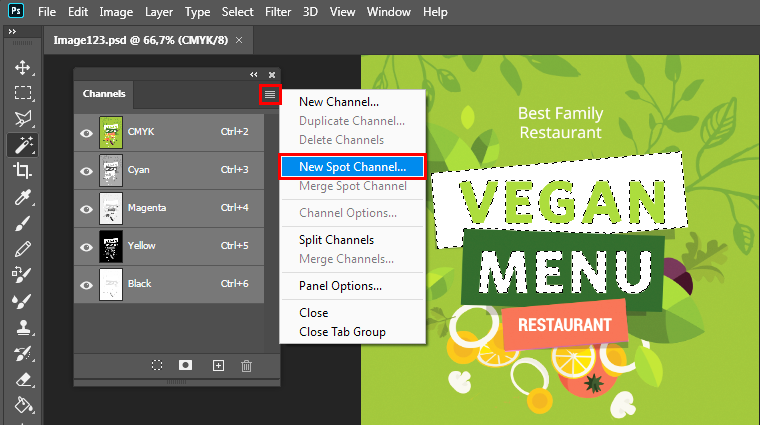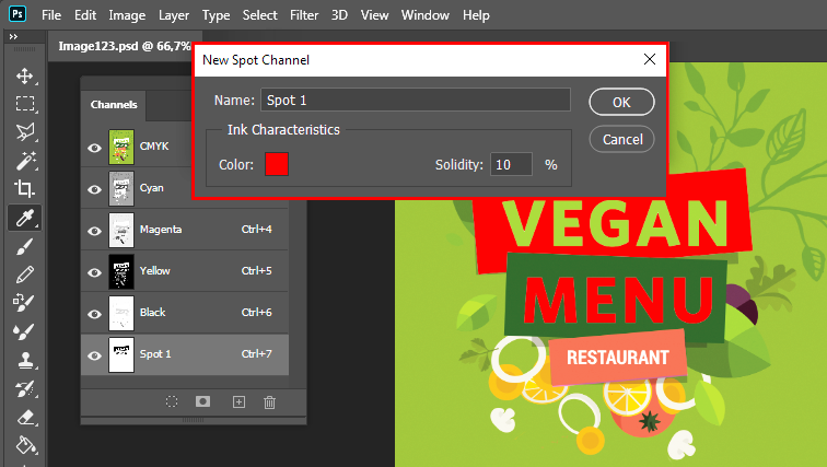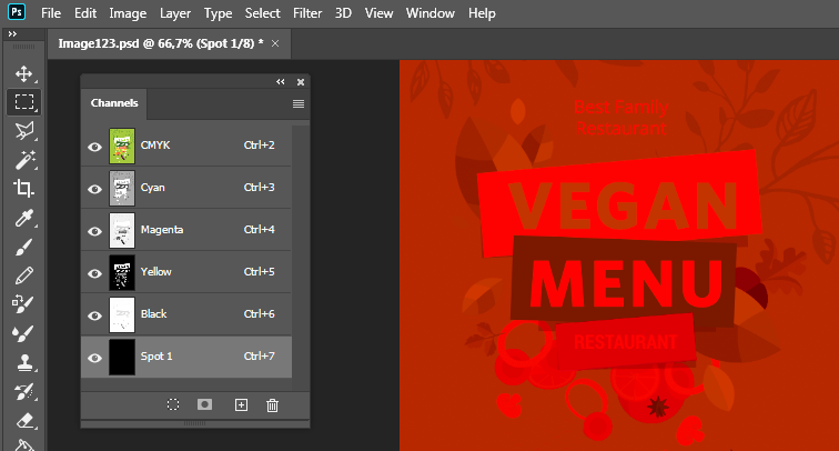I det här avsnittet förklaras hur du förbereder rasterbaserade bilder för utskrift av filer med dekorfärger. På Adobe Photoshop kan du skapa spotkanaler för att definiera vita eller glansiga element i ett utskriftsjobb. Det finns två spotkanaler tillgängliga: Spot1 och Spot2. I allmänhet används Spot1 data för att definiera vita områden och Spot2 data för att definiera områden med lack/glans.