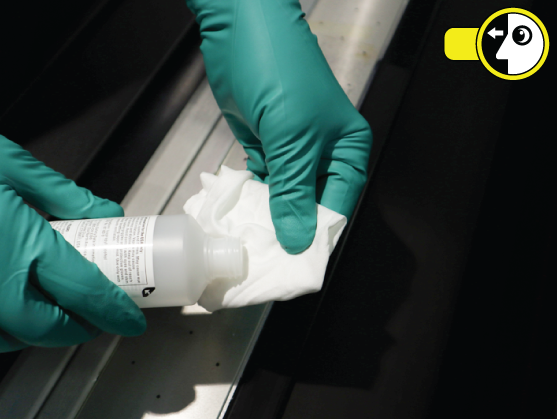 Fukt en ny klut med isopropylalkohol Det kan være vanskelig å se om alt blekk har forsvunnet fra overflaten eller ikke. Fortsett å fukte og tørke av capstan-overflaten inntil kluten ikke lenger viser noen tegn på blekkfarge.