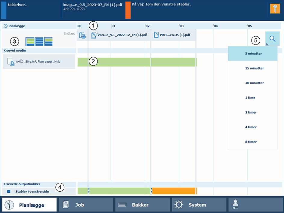 Visningen [Planlægge] Jobruden viser opgaverne på en tidslinje. Jobbredden svarer til den (resterende) udskrivningstid. En lodret linje adskiller jobbene. Den lodrette linje flyttes til venstre, efterhånden som udskrivningen af et job skrider frem.