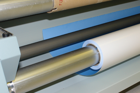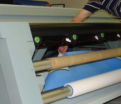 Con Lado de impresión fuera, el material se desenrolla desde la parte inferior del eje de suministro.