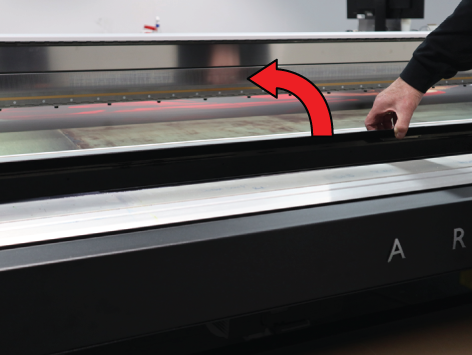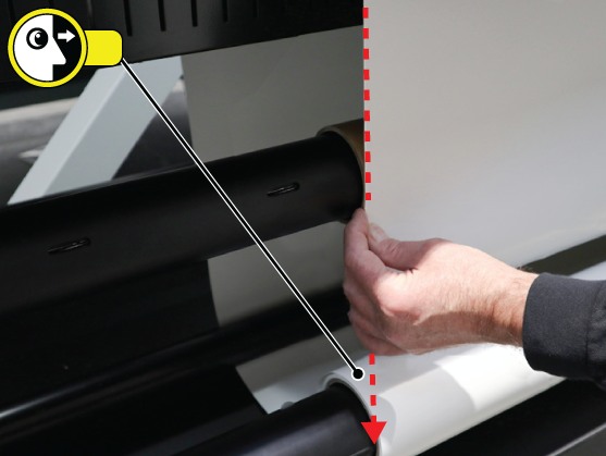 De standaard manier om materiaal te plaatsen is snel en eenvoudig, en garandeert dat de hoeveelheid afvalmateriaal tot een minimum wordt beperkt. Voor sommige grotere printopdrachten, of als u materiaal gebruikt dat flexibeler is en dus lastiger is om goed uit te lijnen, bestaat er een alternatieve methode. Deze wordt besproken in het volgende gedeelte. Een rechte plaatsing van rolmateriaal is erg belangrijk om kreukels of streepvorming op de print te voorkomen, met name bij printopdrachten met een langere doorlooptijd. Als u wilt garanderen dat het materiaal recht geplaatst is, of als u afwisselende streepvorming (licht/donker) ziet over het materiaal, adviseren we de alternatieve methode.
