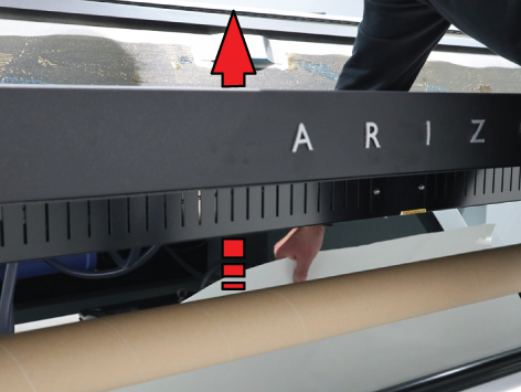 Het materiaal onder de materiaalspanningsbalk voeren (Printzijde buiten)