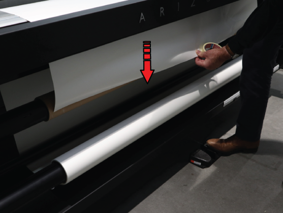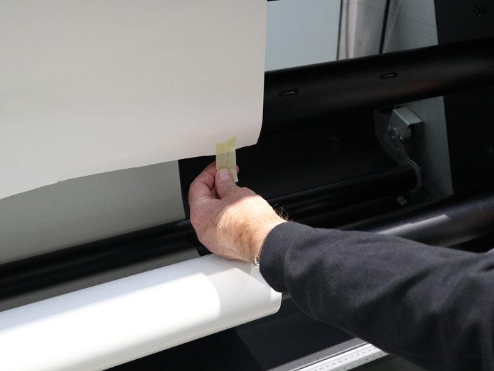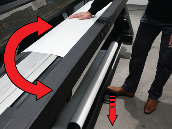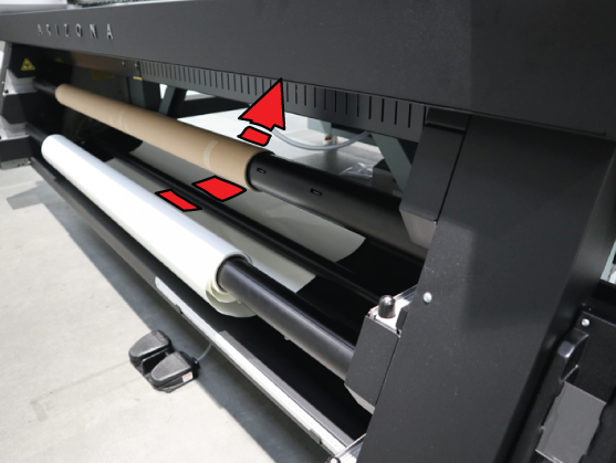 Ο τυπικός τρόπος φόρτωσης μέσου είναι γρήγορος και αποτελεσματικός και διασφαλίζει ελάχιστα απορρίμματα του υλικού. Ωστόσο, για ορισμένες εργασίες εκτύπωσης μεγαλύτερης διάρκειας ή όταν χρησιμοποιείτε μέσο που είναι πιο ευέλικτο και επομένως είναι δυσκολότερο να επιτευχθεί σωστή ευθυγράμμιση, υπάρχει μια εναλλακτική μέθοδος που θα περιγραφεί στην επόμενη ενότητα. Η ίσια φόρτωση του μέσου σε ρολό είναι πολύ σημαντική για την αποφυγή ζαρών και ζωνών στην εκτύπωση, ειδικά σε εργασίες εκτύπωσης μεγαλύτερης διάρκειας. Εάν θέλετε να βεβαιωθείτε ότι το μέσο έχει φορτωθεί ίσια ή εάν υπάρχουν ανεστραμμένες ανοιχτές/σκούρες ζώνες κατά πλάτος του μέσου, συνιστάται η εναλλακτική μέθοδος.