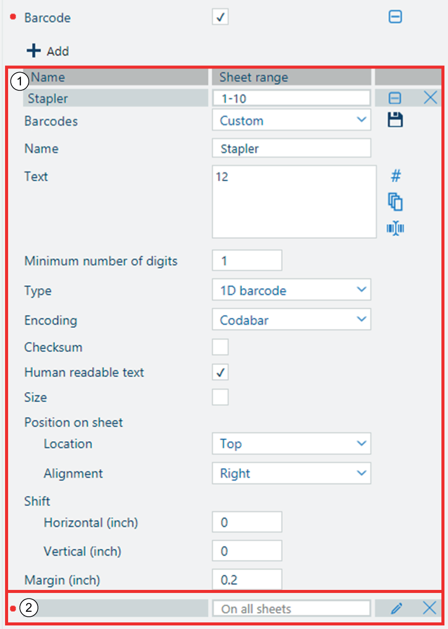 Wpisany tekst i wszelkie zmienne zostają przekształcone w kod kreskowy. Typ kodu kreskowego określa, czy można używać cyfr, tekstu, zmiennych, czy ich kombinacji w tekście. Do tekstu kodu kreskowego można dodać numer arkusza, łączną liczbę arkuszy i nazwę zadania. Finiszery mogą używać tych informacji do sprawdzania, czy kolejność arkuszy jest poprawna i czy zadanie zawiera wszystkie arkusze.