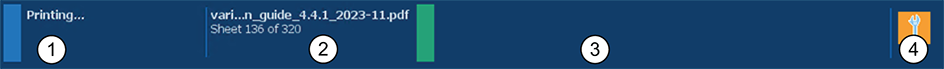 Muestra el nombre del archivo del trabajo en curso (para la impresión de un documento) o el flujo de trabajos en curso (para la impresión de varios). Además, se muestra el progreso del trabajo actual. Para la impresión de documentos, el contador puede mostrar la siguiente información.