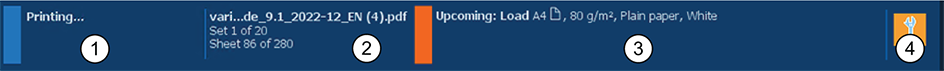 La siguiente ilustración muestra el área de estado mientras la impresora está en curso. La barra de estado vertical es naranja. Al lado de la barra de estado, el área de estado muestra un mensaje que indica cuál es la acción que se va a requerir.