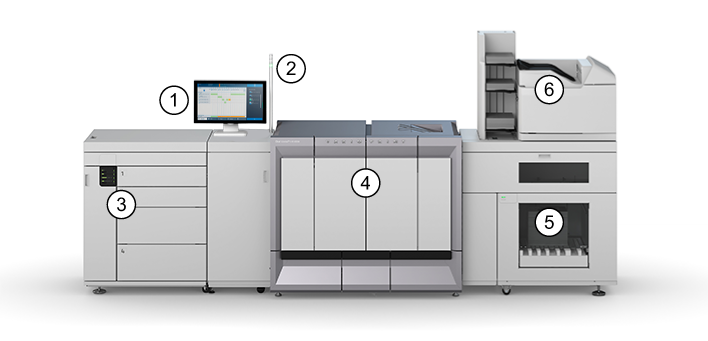 In de volgende afbeeldingen worden de hoofdonderdelen van het systeem weergegeven. In de tabel worden de hoofdonderdelen beschreven. Ga naar de koppelingen in de tabel voor uitgebreide informatie.