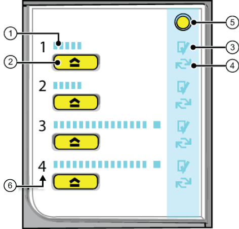 输纸模块上的控制面板每个输纸模块的上层纸盒旁边都包含一个控制面板。控制面板由 4 个部分组成,分别对应于 4 个纸盒。每个部分均可显示对应纸盒的当前填充水平。此外,控制面板还可指示纸盒中的介质是否分配。下表说明控制面板的各个部件。